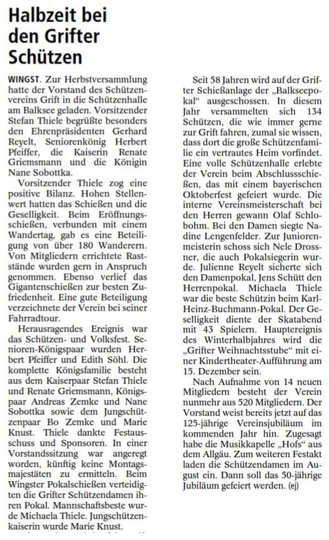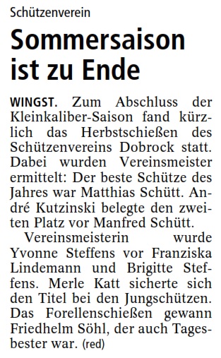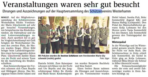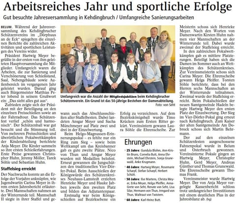 Schießmeister Ronald Wenk berichtete über die Teilnahme von sechs Schießmann-schaften an den verschie-densten Winterrundenwett-kämpfen. Zwei Mannschafts-siege wurden verbucht.