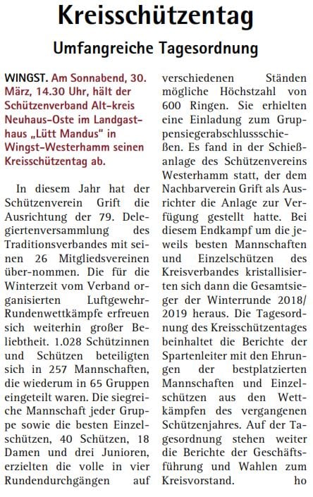 WINGST. Am Sonnabend, 30. März, 14.30 Uhr, hält der Schützenverband Altkreis Neuhaus-Oste im Landgasthaus „Lütt Mandus“ in Wingst-Westerhamm seinen Kreisschützen-tag ab. In diesem Jahr hat der Schützenverein Grift die Ausrichtung der 79. Delegiertenversammlung des Traditions-verbandes mit seinen 26 Mitgliedsvereinen übernommen.