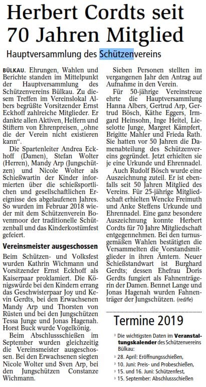 Der Terminkalender des Vereins ist schon jetzt gut gefüllt. So ist der Schützenverein in diesem Jahr turnusmäßig Ausrichter des Ostemündungspokalschießens und des Senioren- und Damen-pokalschießens. Ein Highlight wird im Juli wieder das mittlerweile 170. Schützenfest sein.