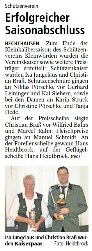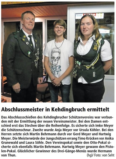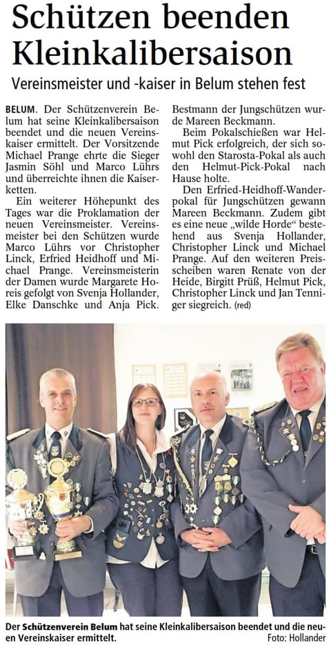 Die Obleute berichteten ebenfalls von vielfältigen Veran-staltungen. Im abgelaufenen Schützenjahr besuchten sie mit gutem Erfolg diverse Pokalschießen. Insbesondere die Jungschützen waren erfolgreich und konnten den Helgo-Magnussenpokal nach Neuhaus holen. Insbesondere für den amtierenden Jungschützenkönig Timo von Bargen wird das vergangene Jahr in guter Erinnerung blieben. Sowohl beim Helgo-Magnussenpokal-, als auch beim Kreisbannerschießen wurde er Tagesbester Einzelschütze. Darüber hinaus konnte er die Würde des Samtgemeindekaisers der Jungschützen erringen.