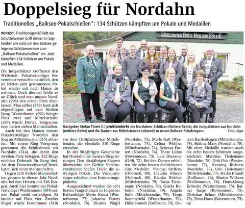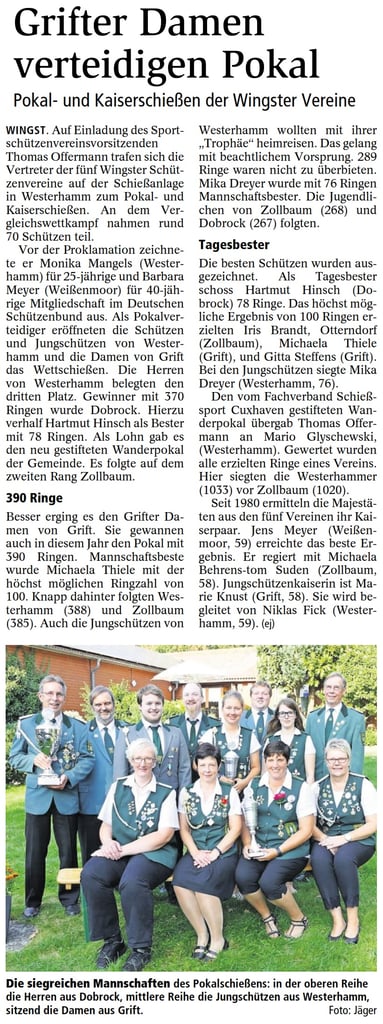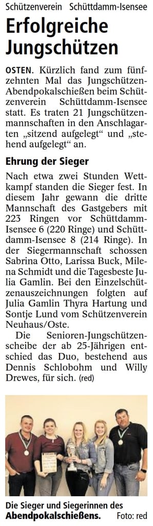 Die Schützen des Schützenvereins Neuhaus gewannen den Ostemündungspokal mit 1445 Ringen knapp vor dem Schützenverein Belum, der den zweiten Platz mit 1406 Ringen belegte. Platz drei sicherte sich der Schützenverein Geversdorf mit 1037 Ringen vor der Baljer Schützengesellschaft mit 998 Ringen auf Platz vier.