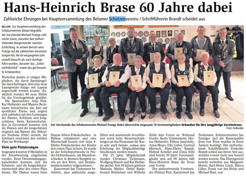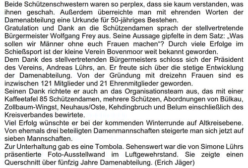Zur Erinnerung an das 50jährige Bestehen hatte er eine vom Kreisschützenmeister Otto Heinsohn unterzeichnete Urkunde mitgebracht, die von der neuen Kreisvorstandskollegin Doris Gehrmann verlesen und überreicht wurde. Zum Abschluss forderte Dirk Mahler die anwesenden auf, sich zu erheben, um die Belumer Damenabteilung hochleben zu lassen.