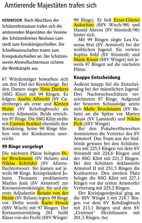 Bei der Wertung der einzelnen Mannschaften gewannen die Schützenherren vom Schützenverein Neuhaus (Oste) mit 373 Ringen den Mannschaftspokal. Bei den Senioren belegten die Schützen aus Belum mit 370 Ringen den ersten Platz.