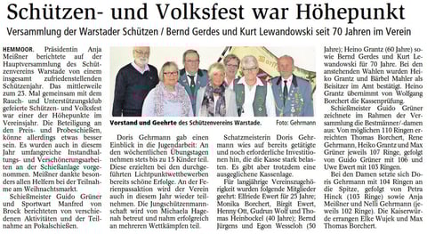 Einzelerfolge errangen Bärbel und Ronald Wenk. Beim Samtgemeinde- und Banner-schießen gab es nur mittlere Plätze. Schatzmeisterin Sandra Thomsen legte dann den Kassenbericht vor. Trotz vieler Pflichtausgaben wurde noch ein Jahresüberschuss erwirtschaftet. Bei den anstehenden Wahlen herrschte Einmütigkeit: Für Sandra Thomsen, Bianca Fonfara, Ronald Wenk, Gisela Unglaube und Bärbel Wenk gab es eine einstimmige Wiederwahl. Neu in den Vorstand wurde Peter Schütt gewählt. Die Termine für das laufende Jahr wurden ebenfalls an diesem Abend festgelegt. Den Auftakt bildet das LG-Winter-Abschluss-schießen am 13. April, es folgt das KK-Eröffnungs-schießen am 4. Mai. Das Schützenfest soll mit dem Kranzbinden am 29. Mai starten, das Fest mit Ball wird am 1. Juni fortgesetzt. Der Umzug, die Schießwett-kämpfe und Proklamation folgen am 2. Juni. Das Montagskönigsschießen ist am 3. Juni vorgesehen. Am 6. Juli soll ein Vogelkönig ermittelt werden und das Kaiserschießen findet am 7. September statt. (red)