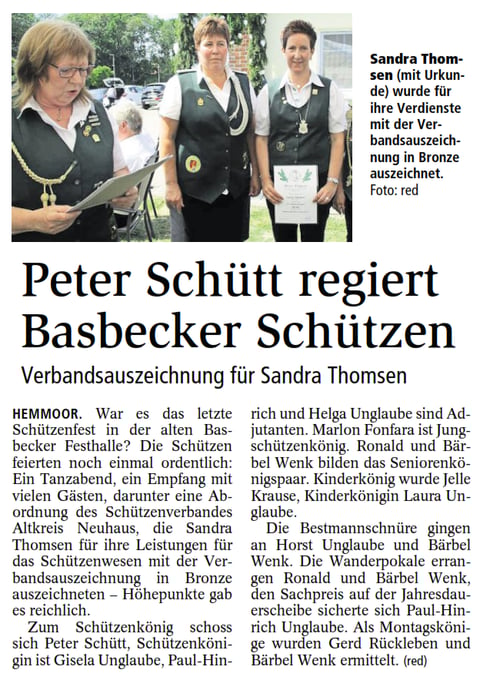 HEMMOOR. Die Mitglieder des Schützenvereins Basbeck trafen sich zur Hauptversammlung. Dort berichtete der Vorstand über viele Arbeitssitzungen, die mit der Rückübertragung des Schützengeländes mit Festhalle an die Stadt Hem-moor inzwischen abgeschlos-sen werden konnten (wir berichteten). Dabei seien auch „gute Nutzungsbe-dingungen“ für den Verein hinsichtlich des „Bürgerhau-ses“ ausgehandelt worden, das die Halle ersetzen wird. Der Vorsitzende Horst Unglaube ernannte anschlie-ßend Walter Hannemann zum Ehrenmitglied. Für ihre 50-jährige Mitgliedschaft wurde Herta Entenmann die goldene Verdienstnadel überreicht. Helga Elfers und Sven Elfers erhielten für 25 Jahre Mitgliedschaft die silberne Ehrennadel.