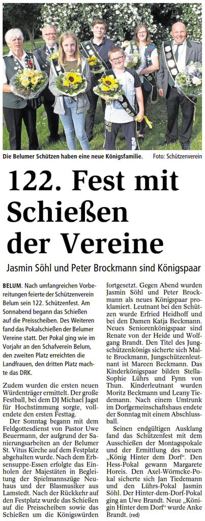 Eine Abordnung von drei Vorstandsmitgliedern des Verbandes (Dirk Mahler, Doris Gehrmann und Jürgen Bauer) machte sich am 29. Juni 2019 auf den Weg nach Belum, um die Grüße vom Kreisschützenmeister Otto Heinsohn und eine Urkunde vom Schützenverband Altkreis Neuhaus-Oste zu überbringen.