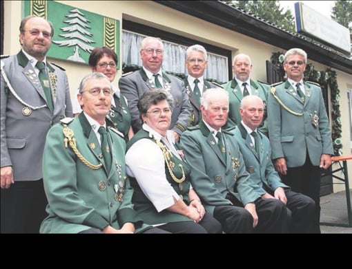 Von links hinten: Abordnung des Schützenverbandes, Otto Heinsohn, stellv. Kreisschüt-zenmeister, Ronald Lührs, Kreisjugendschießwart und Gerd Brokelmann, Verbands-geschäftsführer. Königin Daniela Woitanowski, König Holger Thiems (VA in Bronze, Jungschützenkönig Tobias Marks, Jutta Heidthoff (VA in Bronze), Gustav Pupke, Präsident, vorne von links: Kinderkönigin Melanie Lerch, Königin beim Vogelstechen Nina von Bargen.