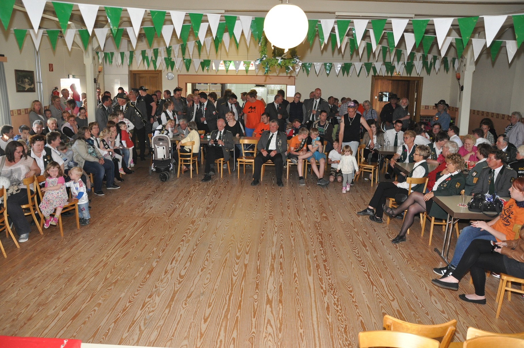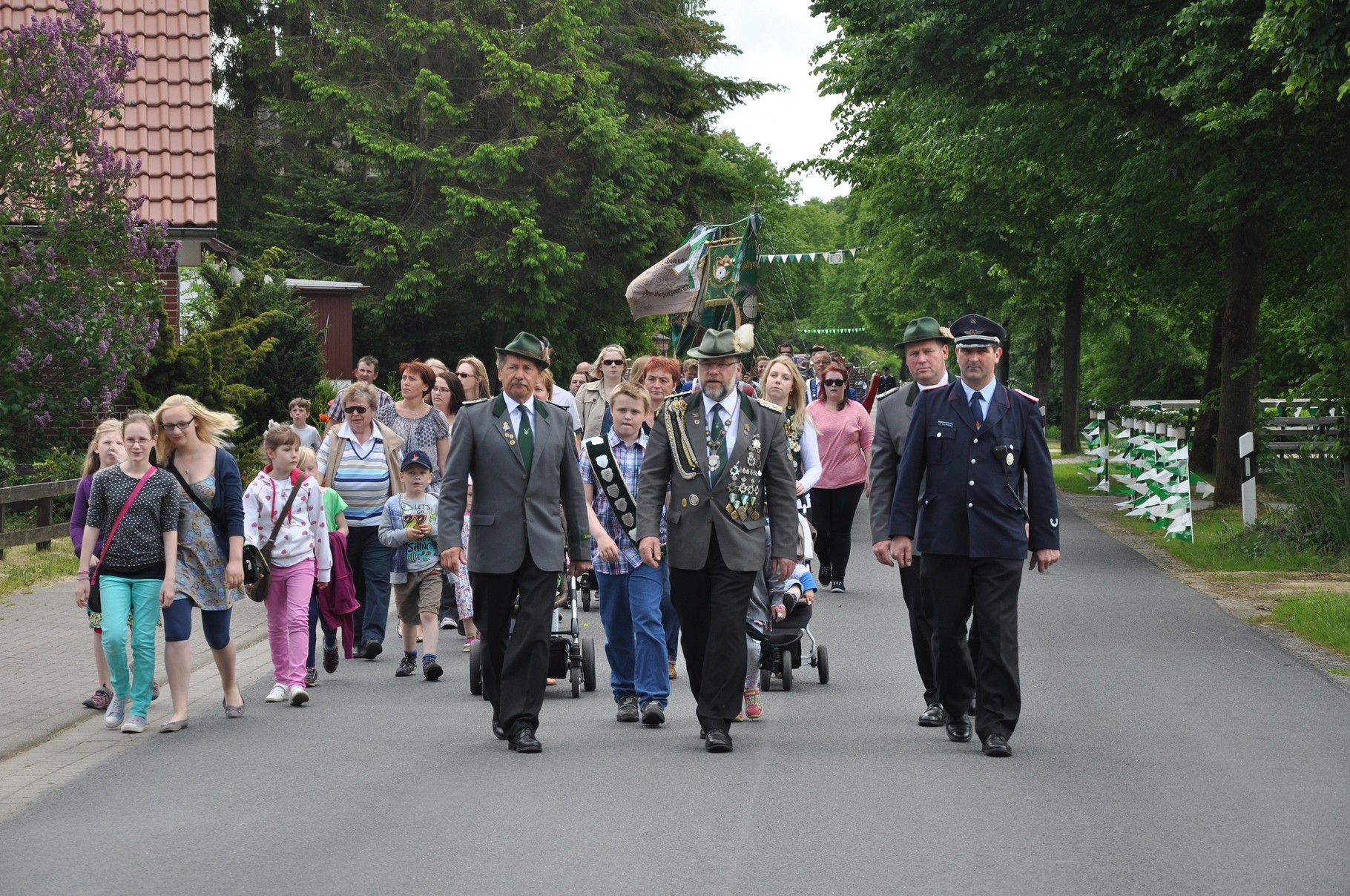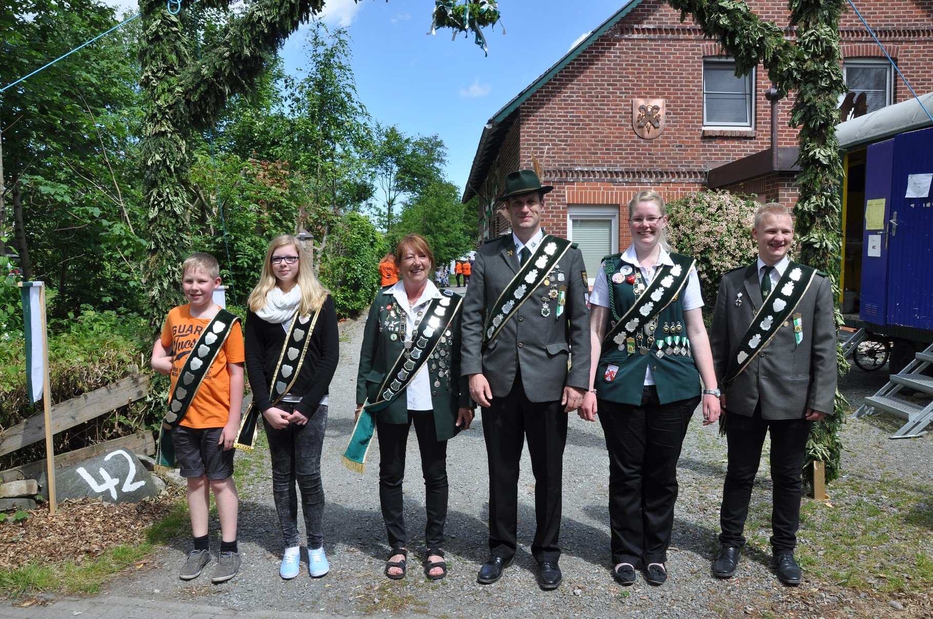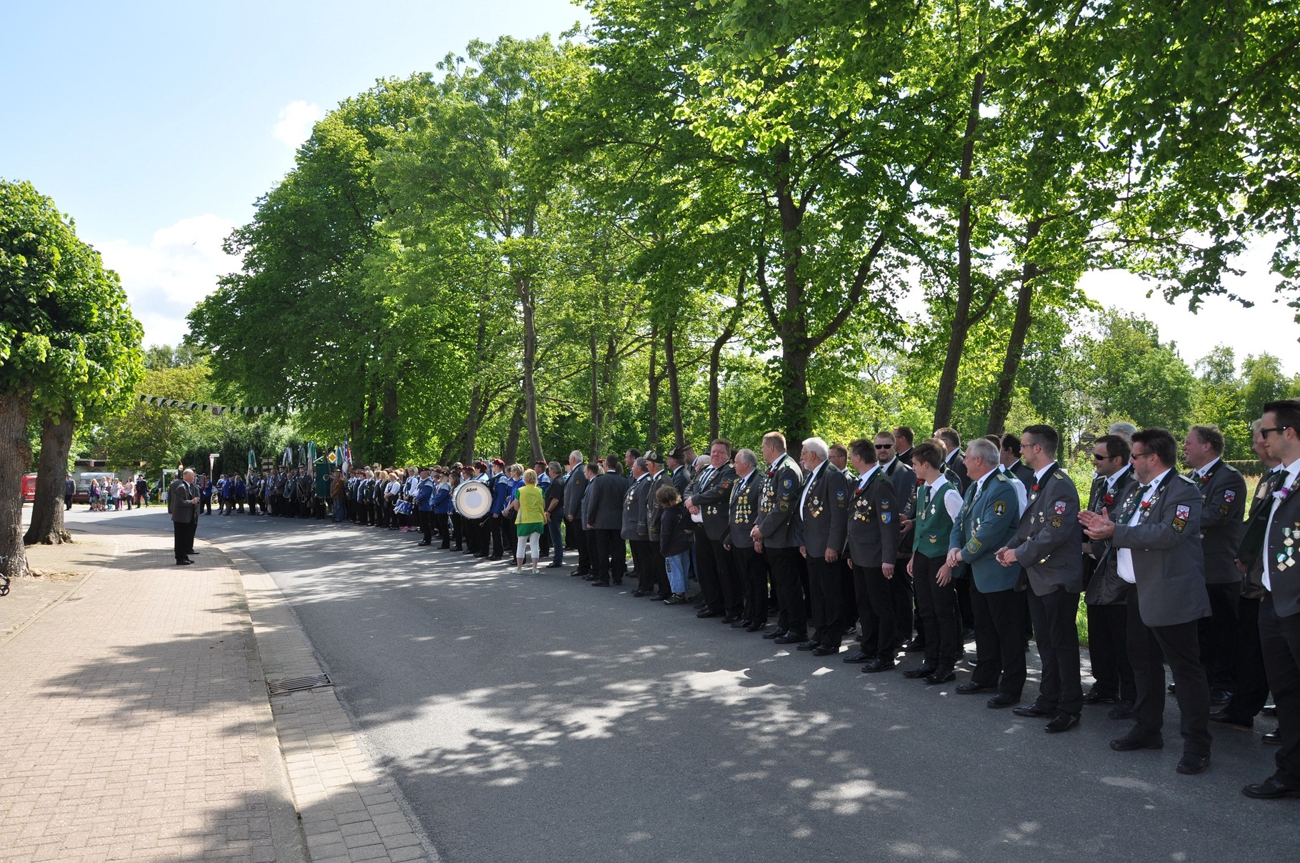 Nach der Begrüßung der Gäste und der Flaggenhissung in der Schießanlage am Gutspark führte der Festumzug zunächst zur Einreihung des Kinderkönigs. Weiter ging es vorbei an den Altenwohnungen, wo die Musikzüge den dort wohnhaften Senioren zur Freude, ein Ständchen überbrachten. Weiter führte der Marsch an der Residenz der Königin entlang zur Einholung der königlichen Majestäten an der Straße "Am Klotzen".
