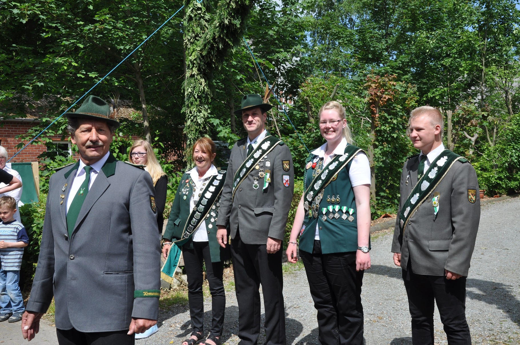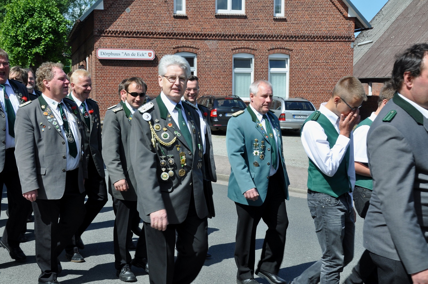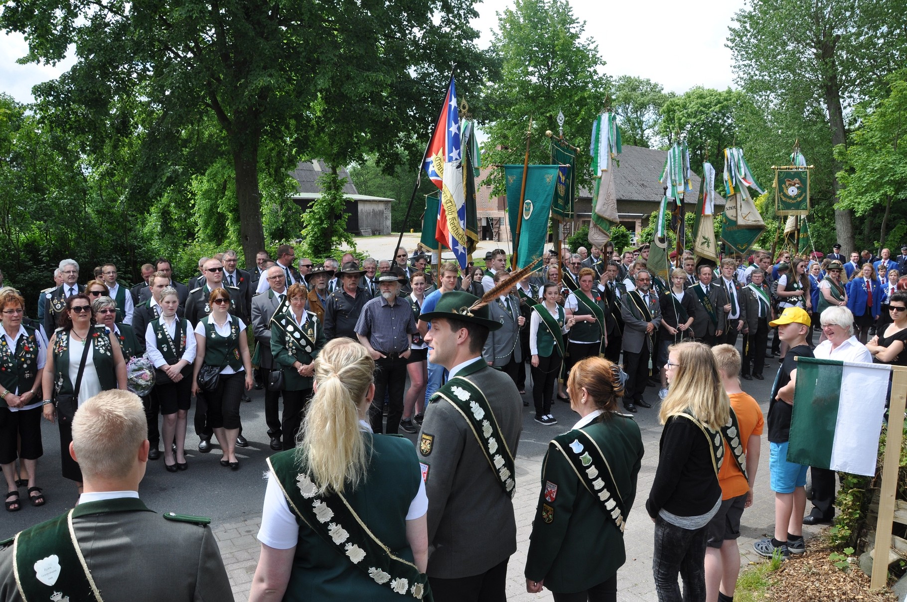 Nach der Begrüßung der Gäste und der Flaggenhissung in der Schießanlage am Gutspark führte der Festumzug zunächst zur Einreihung des Kinderkönigs. Weiter ging es vorbei an den Altenwohnungen, wo die Musikzüge den dort wohnhaften Senioren zur Freude, ein Ständchen überbrachten. Weiter führte der Marsch an der Residenz der Königin entlang zur Einholung der königlichen Majestäten an der Straße "Am Klotzen".