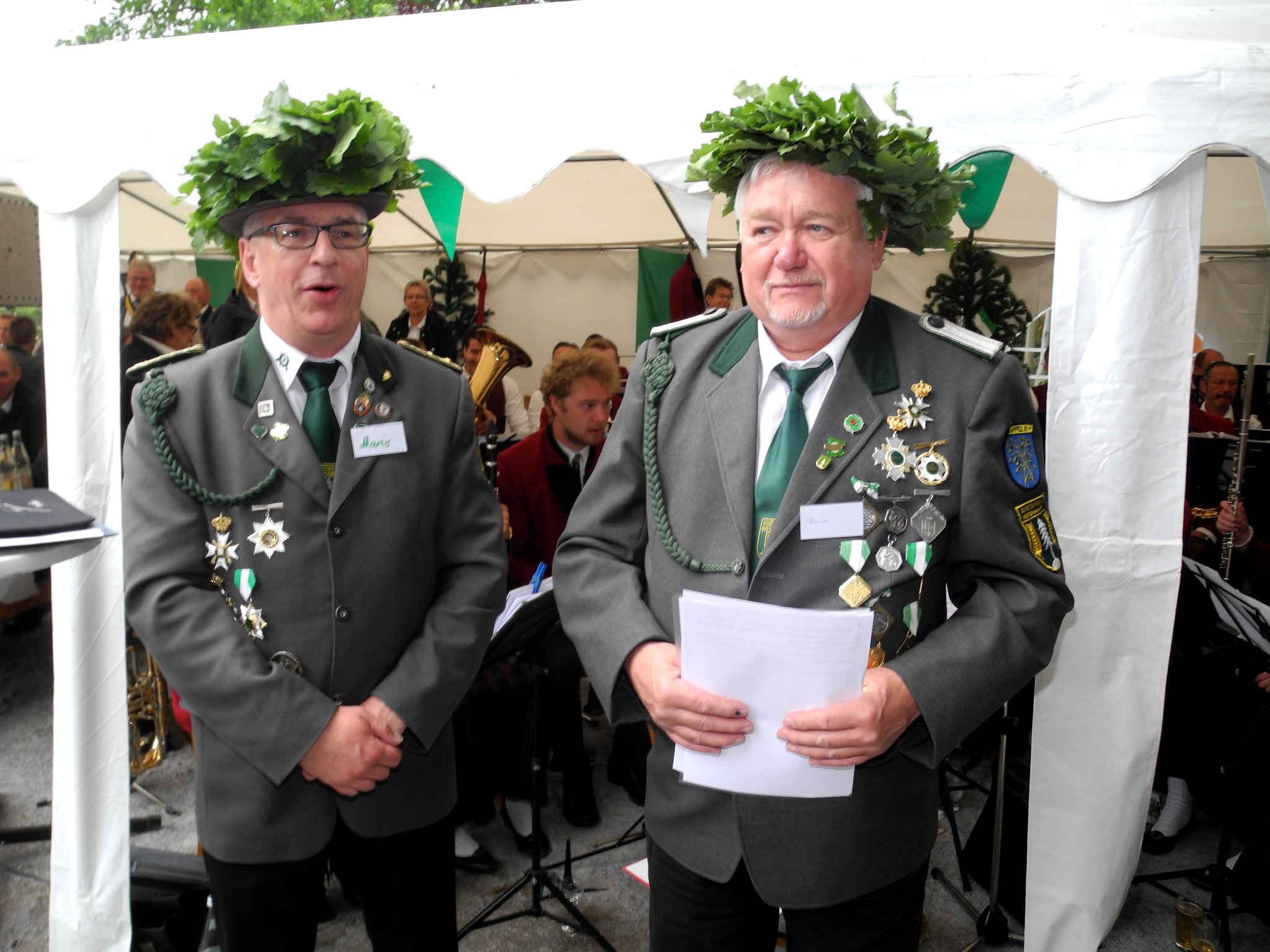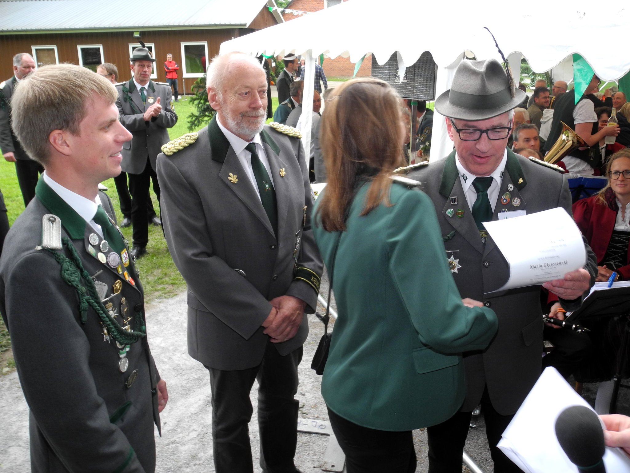 Mario schaute sich die Zeremonie ganz entspannt an weil er immer noch glaubte, dass gleich sein Fahnenträger Heiner Hebbe für die Verbandsauszeichnung aufgerufen werde. Der stellvertretene Kreisschützenmeister Stefan Thiele verlas die Laudatio und als erster zu Ehrender wurde zur Überraschung aller Mario Glyschewski aufgerufen, um die Bronzene Verbandsauszeichnung entgegenzunehmen.