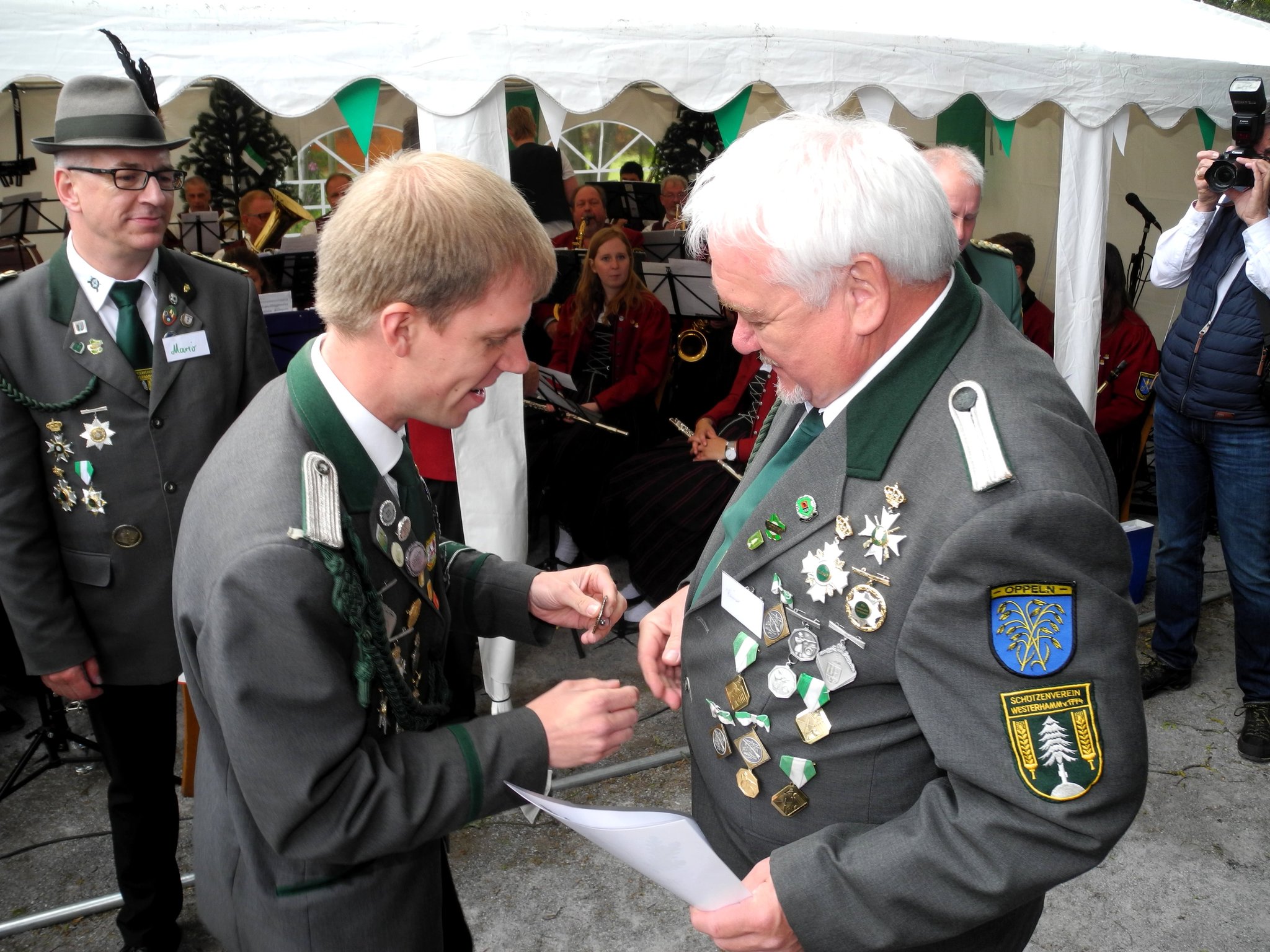 Beim Antreten, im Gespräch zwischen dem Präsidenten und dem Kreisschützenmeister Otto Heinsohn zeigte sich, dass er absolut Ahnungslos war und keine Vermutung hatte, dass der Vorstand mit zwei Ehrungen in Westerhamm erschienen war.