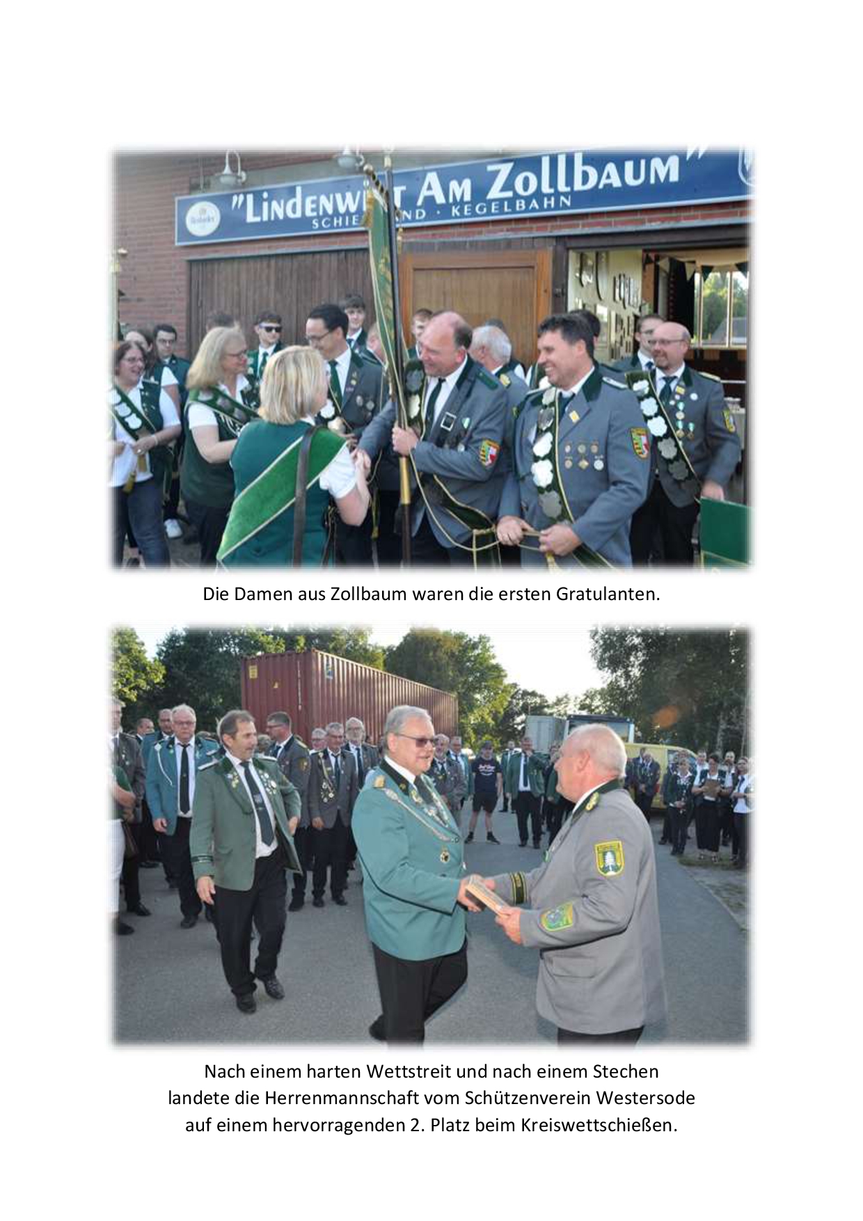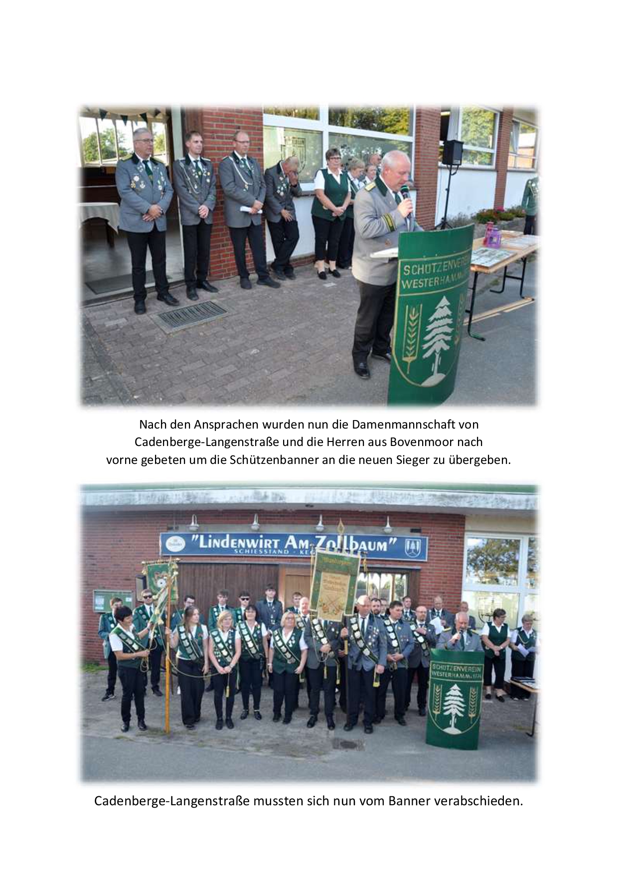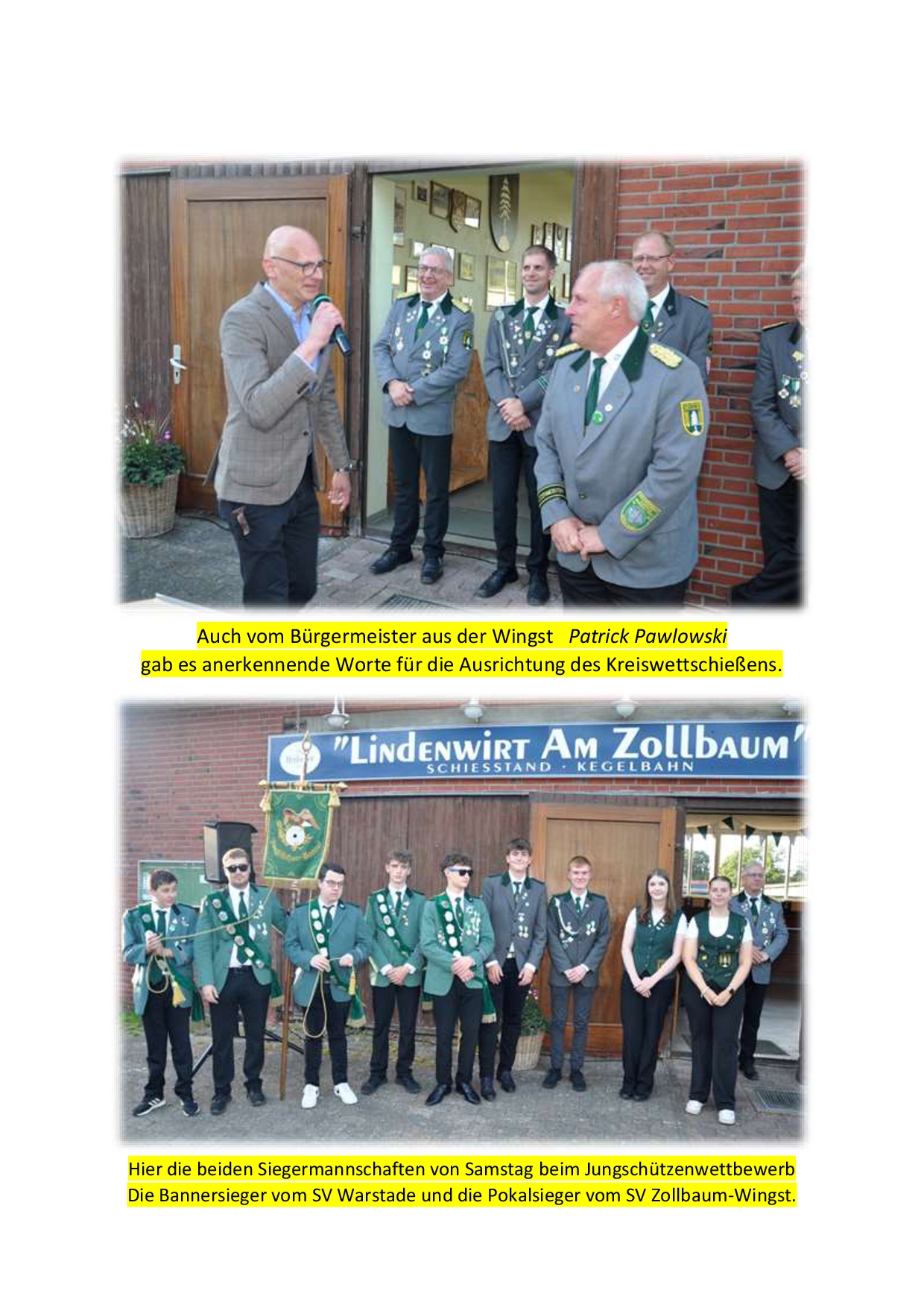 Vor der Siegerehrung lobten Patrick Pawlowski als Bürgermeister der Gemeinde Wingst sowie der stellv. Samtgemeindebürgermeister der SG Land Hadeln Wolfgang Hess das ehrenamtliche Engagement aller hiesigen Schützenvereine. Sie bilden die Grundlage für gesellschaftlichen Zusammenhalt und sind eine wichtige Basis auch für die Jugendarbeit in der Region. Anschließend kürten der Kreisschützenmeister Stefan Thiele und sein Vorstandkollegium die Sieger des Tages. Den Gastgebern vom SV Westerhamm und Zollbaum-Wingst sowie dem Team des Gasthauses Butt – Lindenwirt am Zollbaum wurde mit großem Applaus gedankt.